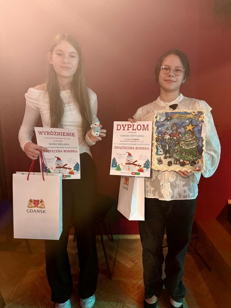 Z radością informujemy, że dnia 18.12.2025r. Vanessa Motylińska i Sasha Bielawa odebrały zasłużone nagrody za swoje piękne prace w 12. Gdańskim Konkursie Plastycznym „Świąteczna Bombka”!